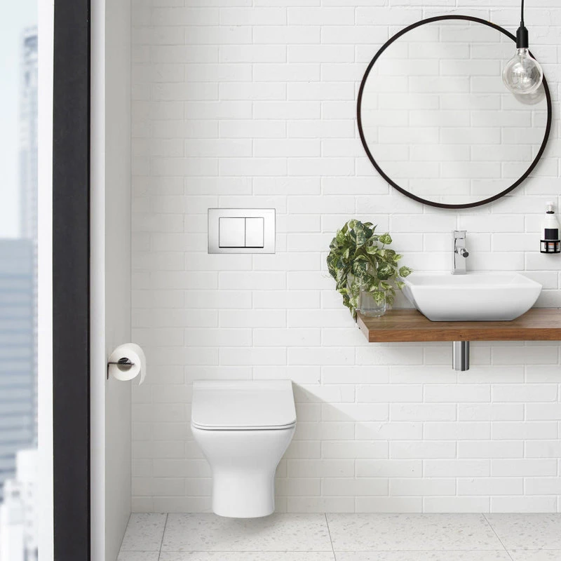 Wall Mount Actuator Flush Push Button Plate in Chrome. This Actuator plate fits with all Swiss Madison concealed wall carriers for use with our wall hung and back to wall toilets. It features two buttons for dual flush compatibility.
