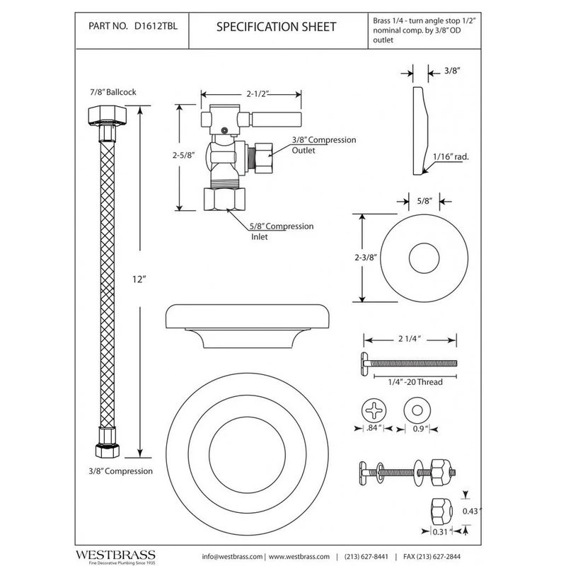 The Westbrass 5/8 in. compression (1/2 in. nominal copper pipe) inlet x 3/8 in OD outlet x 12 in. length brass toilet supply kit makes it easy to outfit your toilet. The kit includes everything required to stylishly supply water to your toilet, including an attractive modern lever handle angle stop, braided supply line, flange and wax ring. Available in a variety of decorative finishes, this is sure to turn a functional but ugly installation into a complementary work of art.